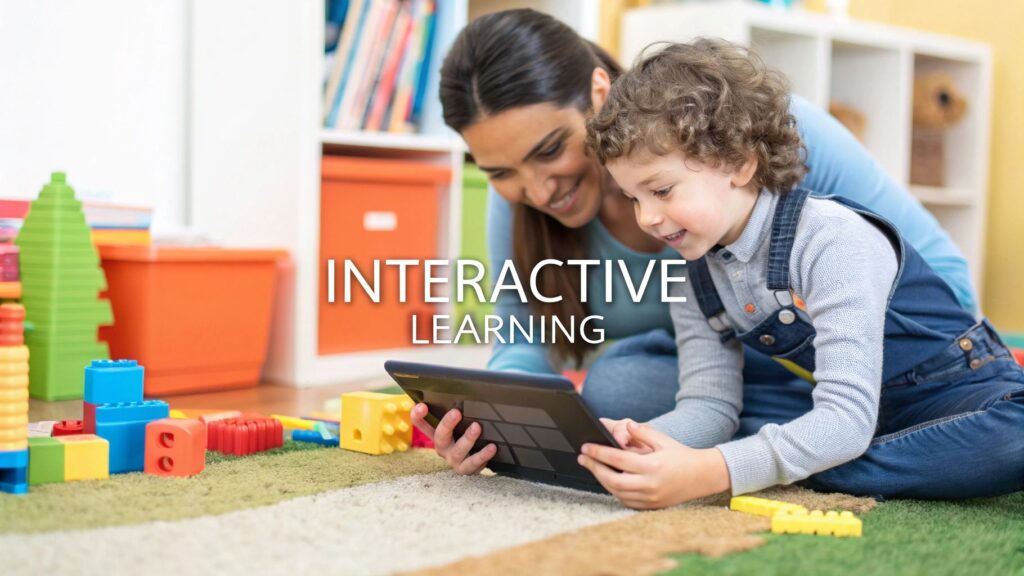 A peaceful bedroom scene with a parent using a sleep app with their child at bedtime